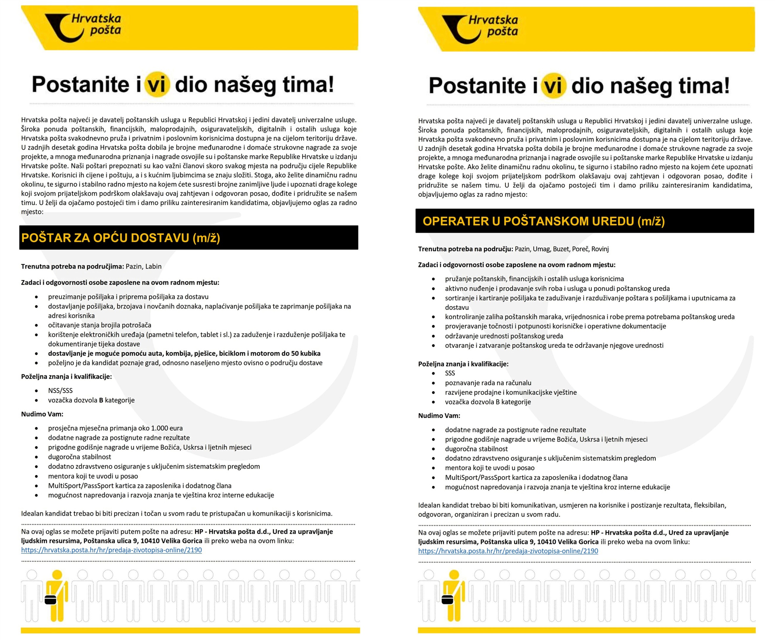 Obavijest - Hrvatska pošta traži poštara za opću dostavu za područje Općine Cerovlje