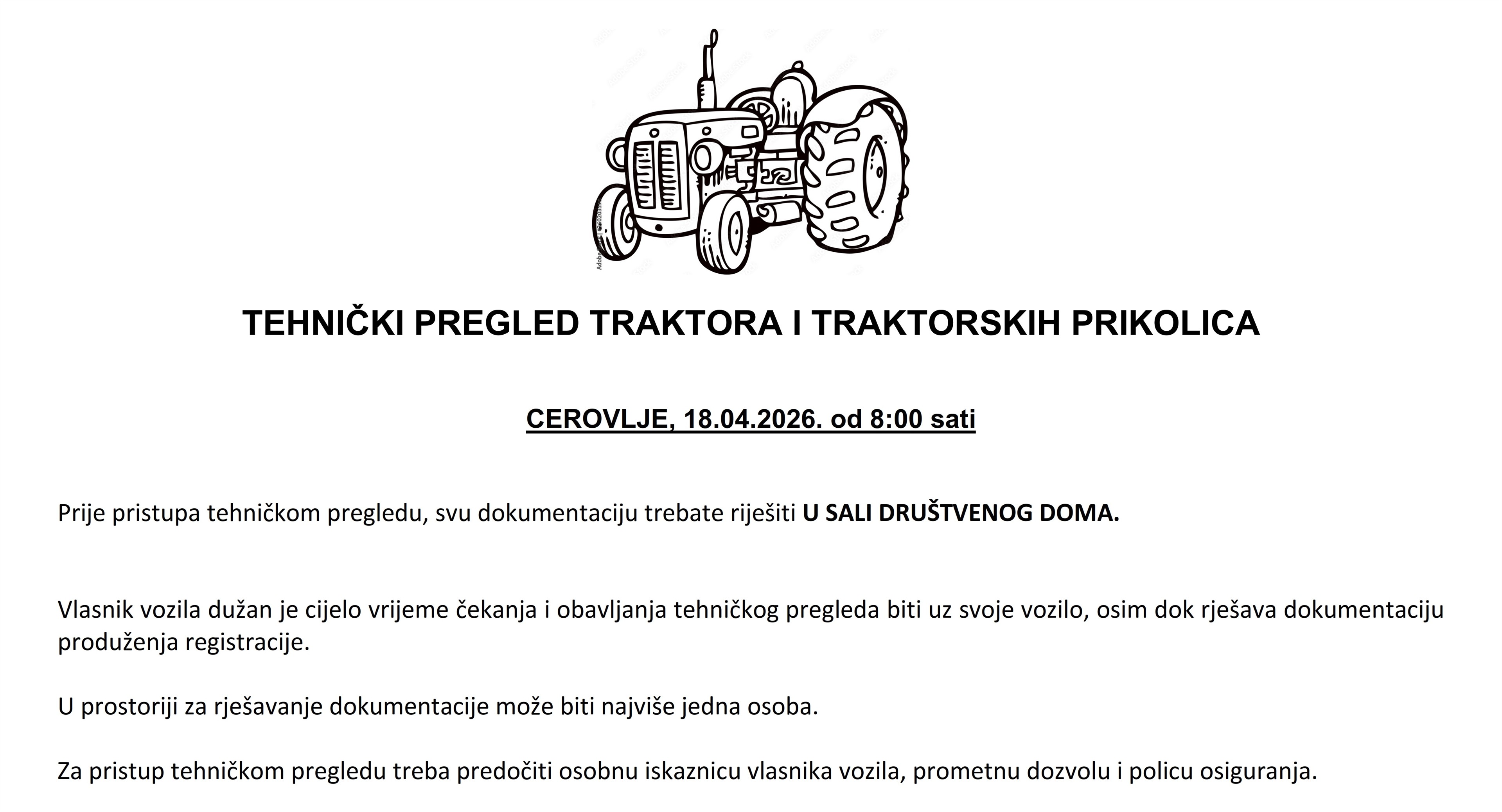 Obavijest - Tehnički pregled traktora u Cerovlju, subota, 18.04.2026. od 8h
